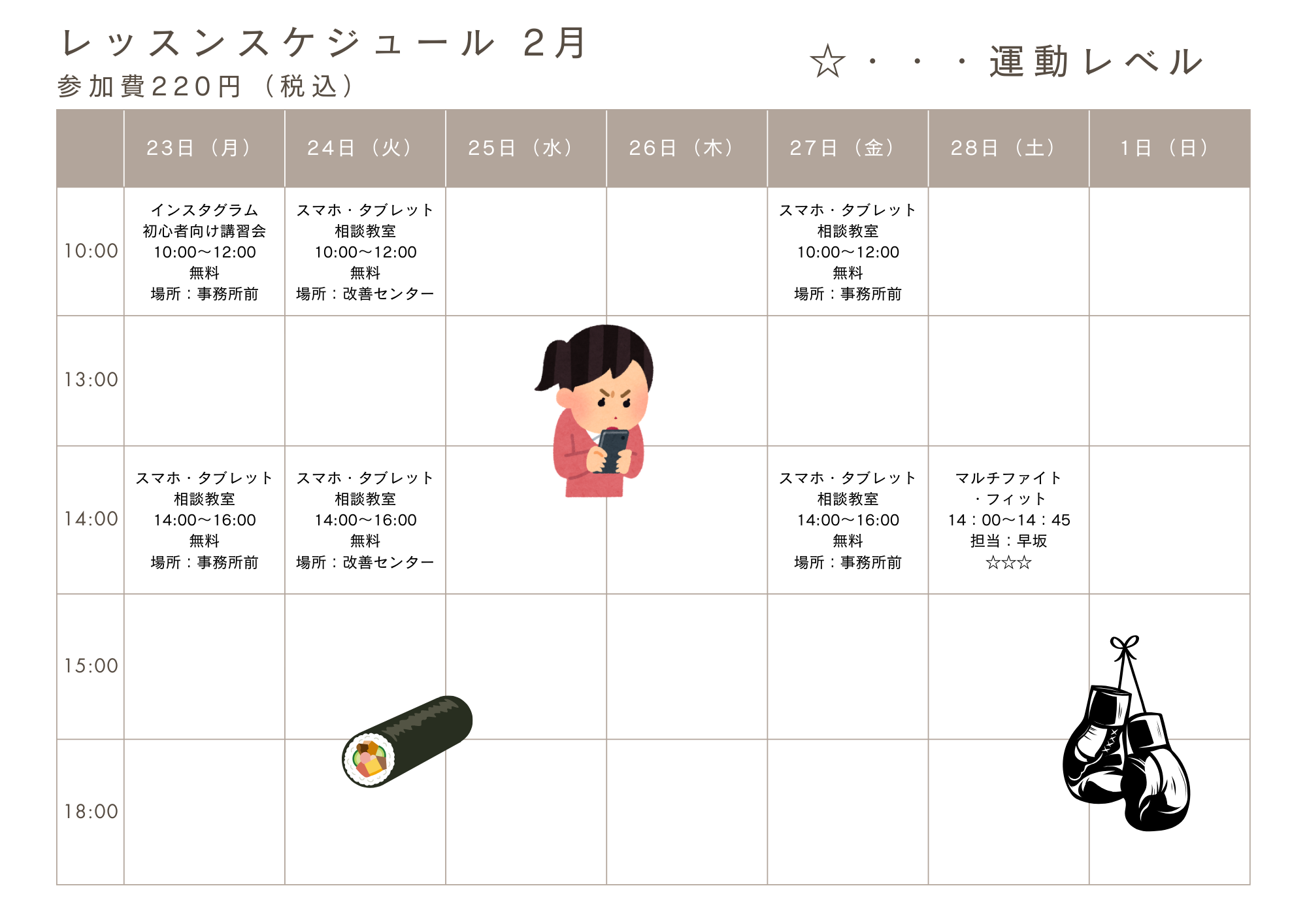 2月23日(月)~3月1日(日)までのレッスン表になります!