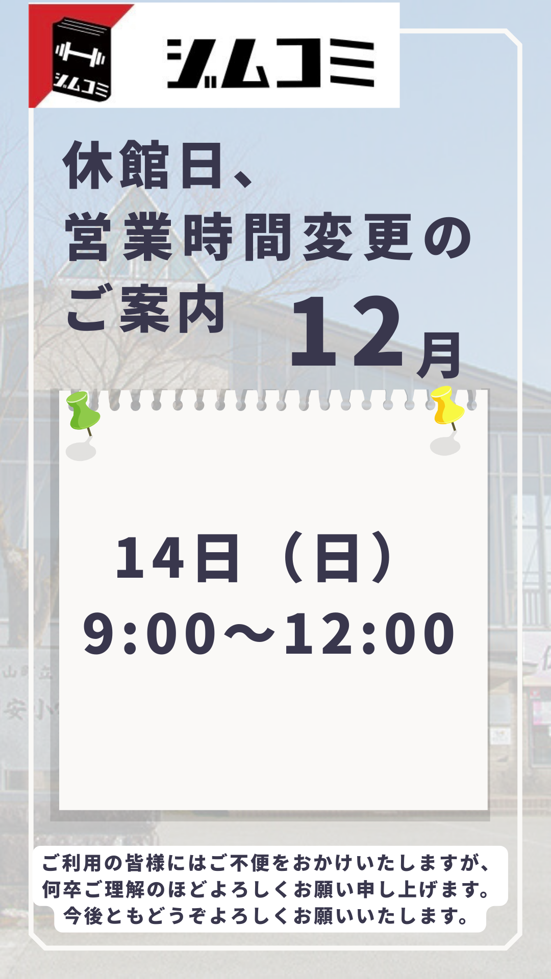 【12月休館日、営業時間変更のご案内】