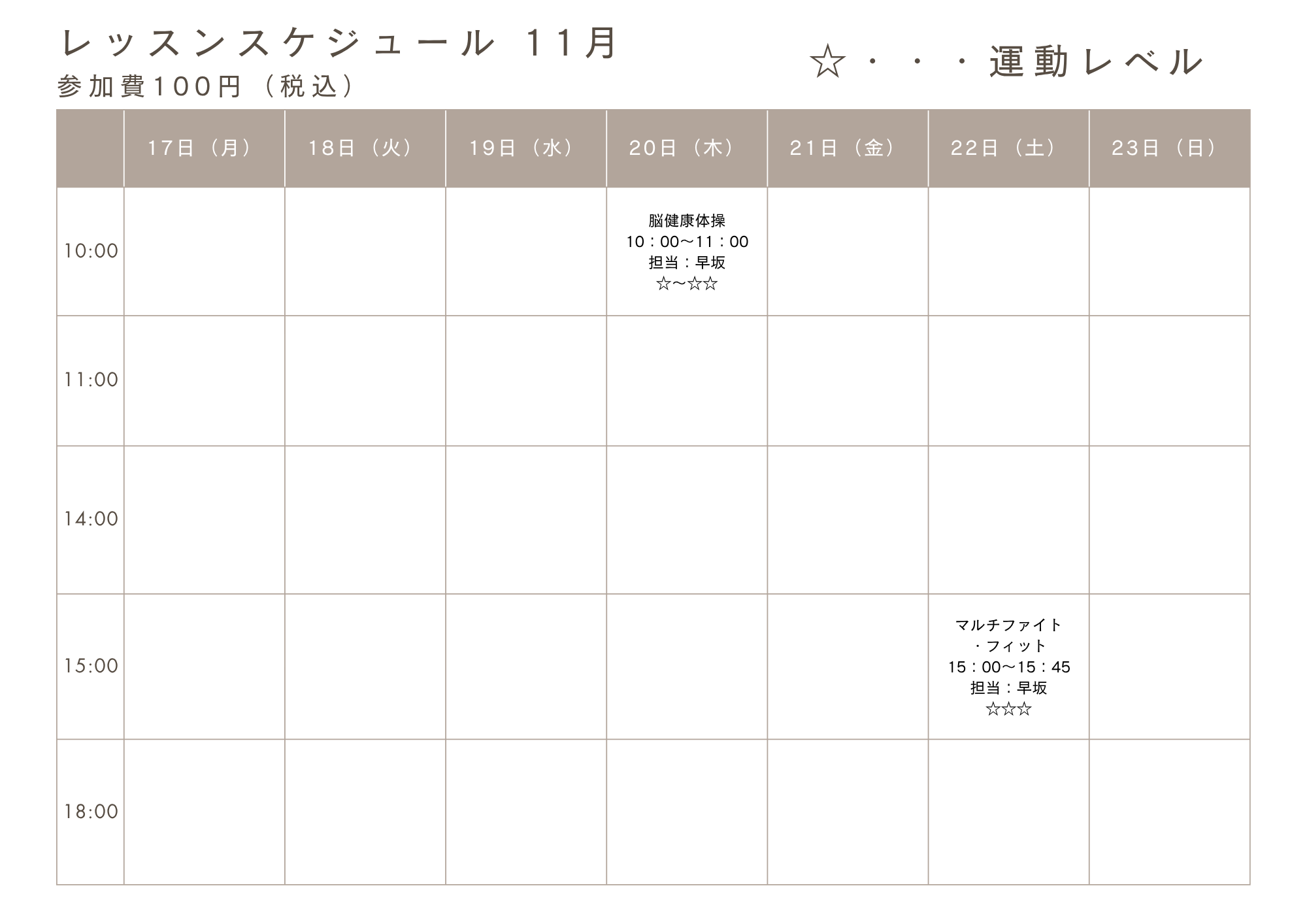 11月17日(月)~11月23日(日)までのレッスン表になります!